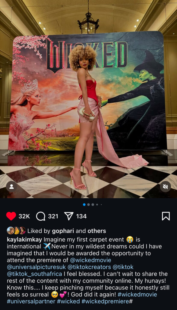 Kayla is currently living it up in London where she attended her first big red carpet event at the premier of the #wickedmovie courtesy of TikTok.